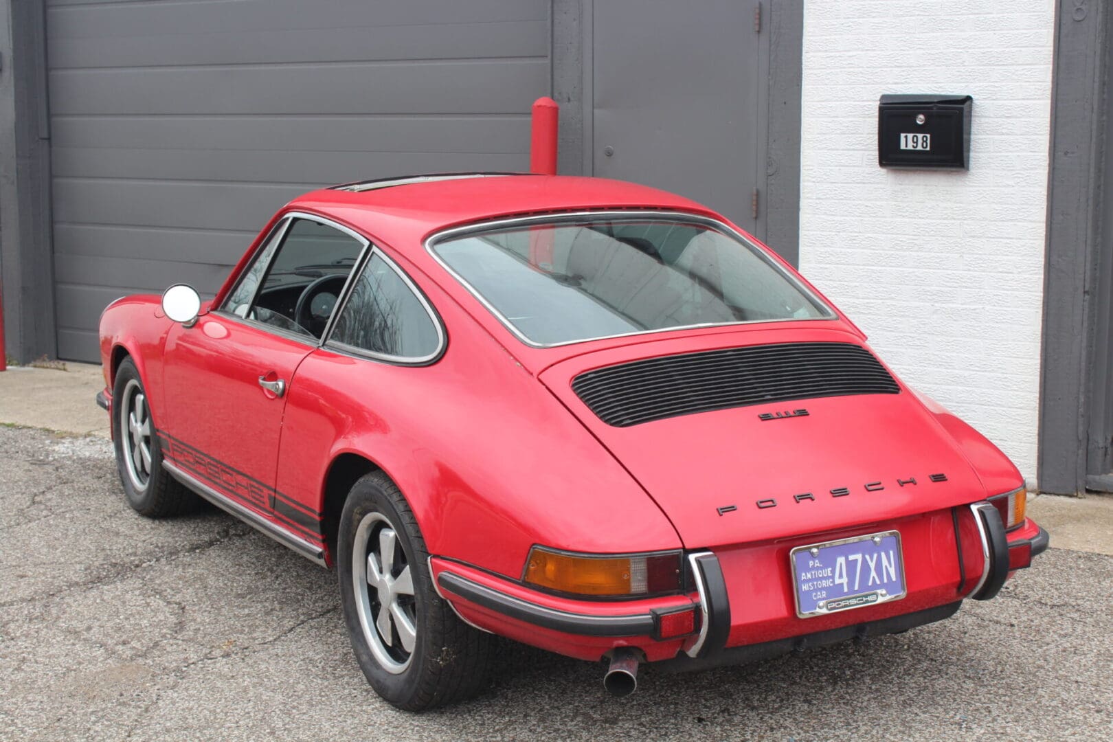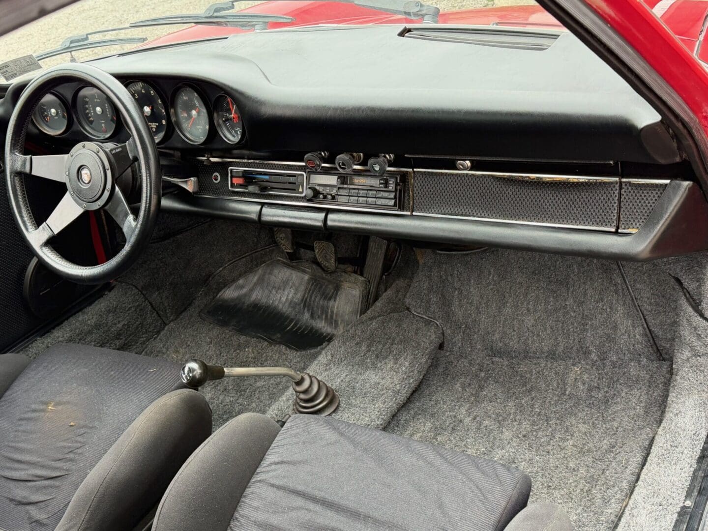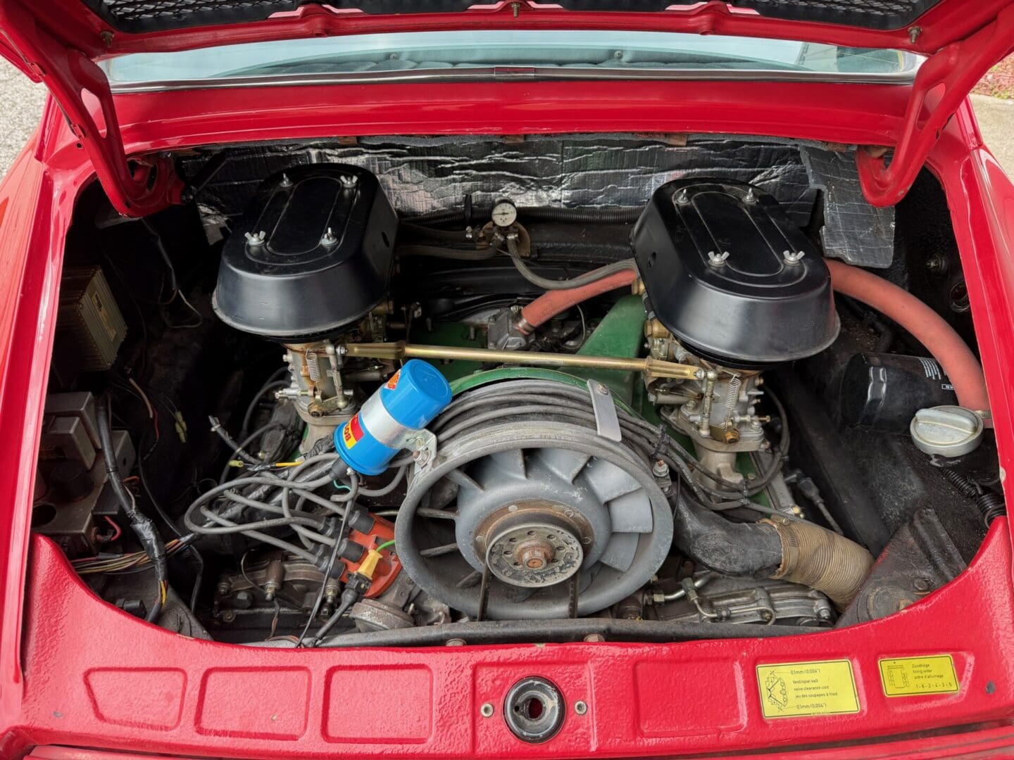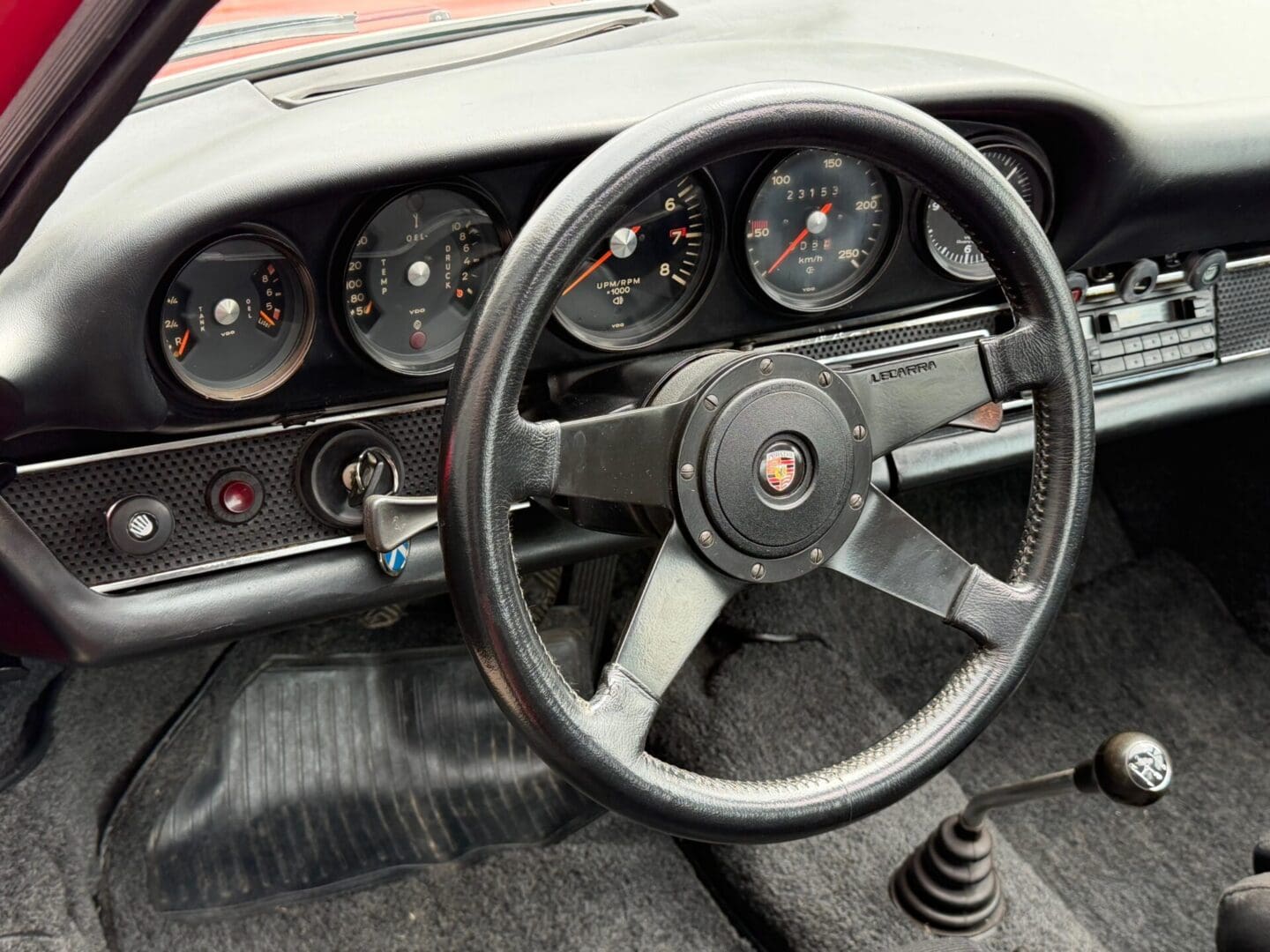A 1970 Porsche 911E Sunroof Coupe.23k kilometer shows on the odometer. Red with a black interior but the original color is tangerine (paint code 2323) Powered by 1978 Porsche 911SC 3.0L engine with Weber’s and original gearbox. European gauges and power sunroof and windows!